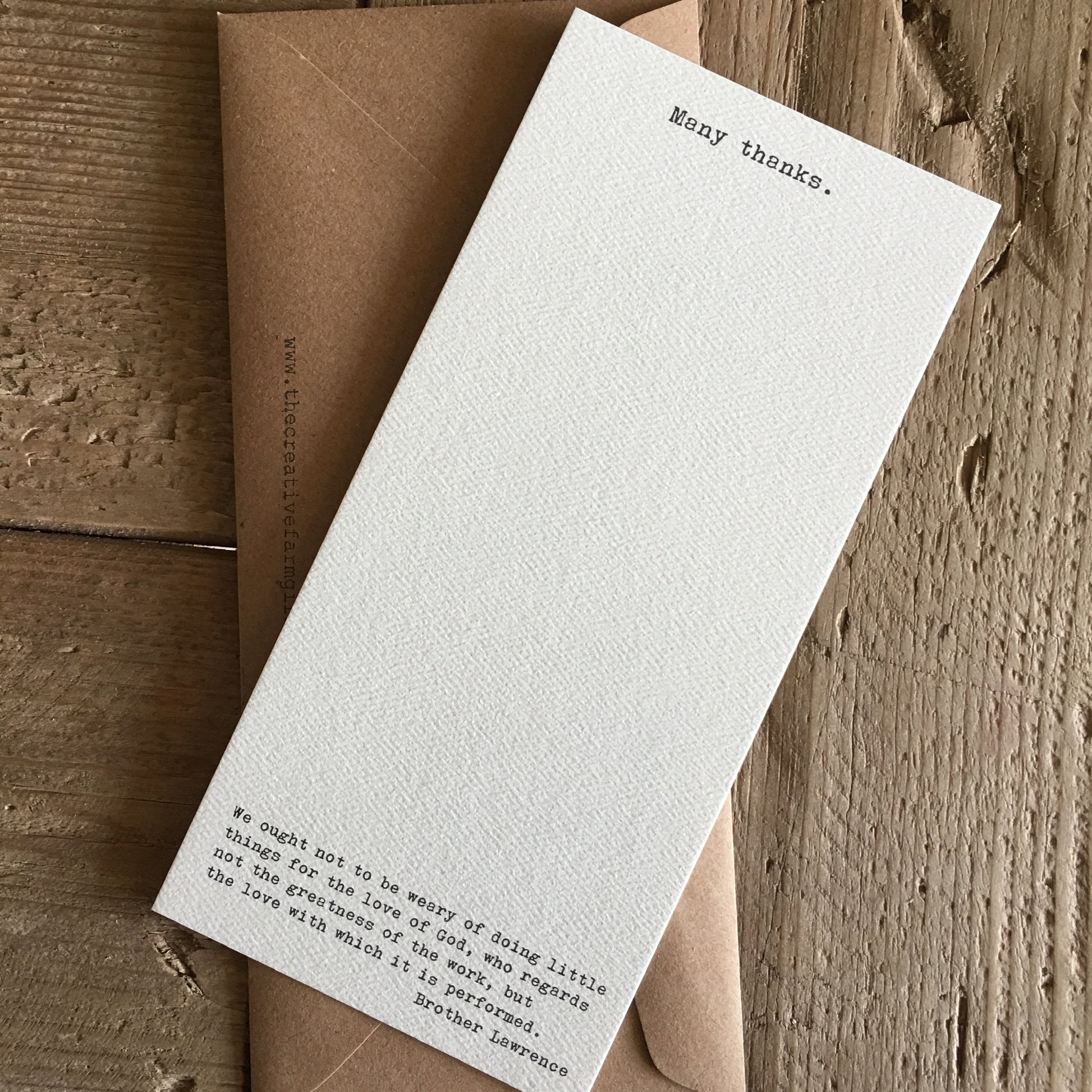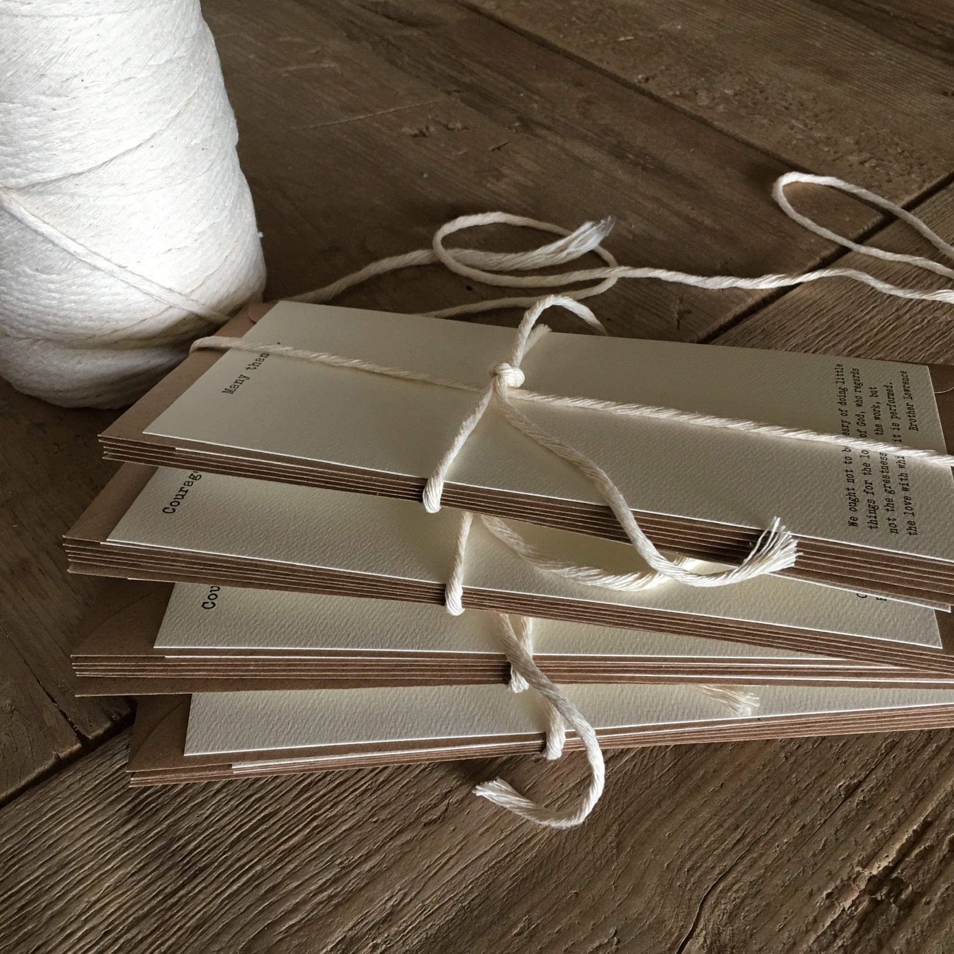 8 1/2 x 4 inches, flat card, 100# felt cover, cream; with grocery bag style A7 envelope