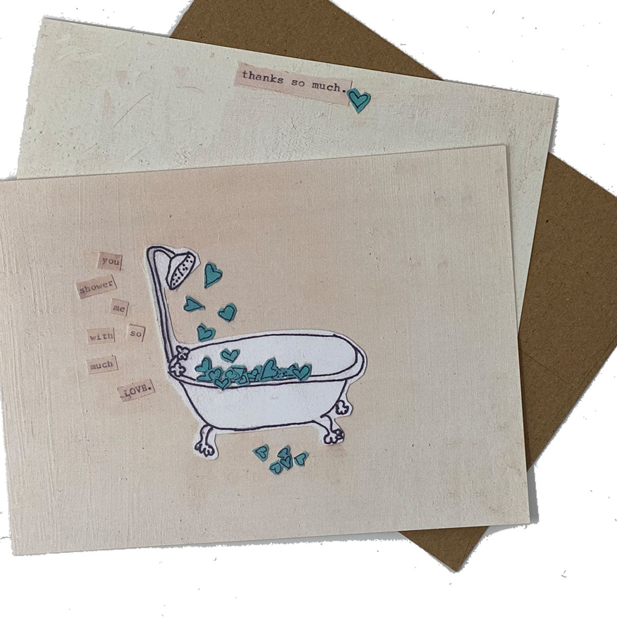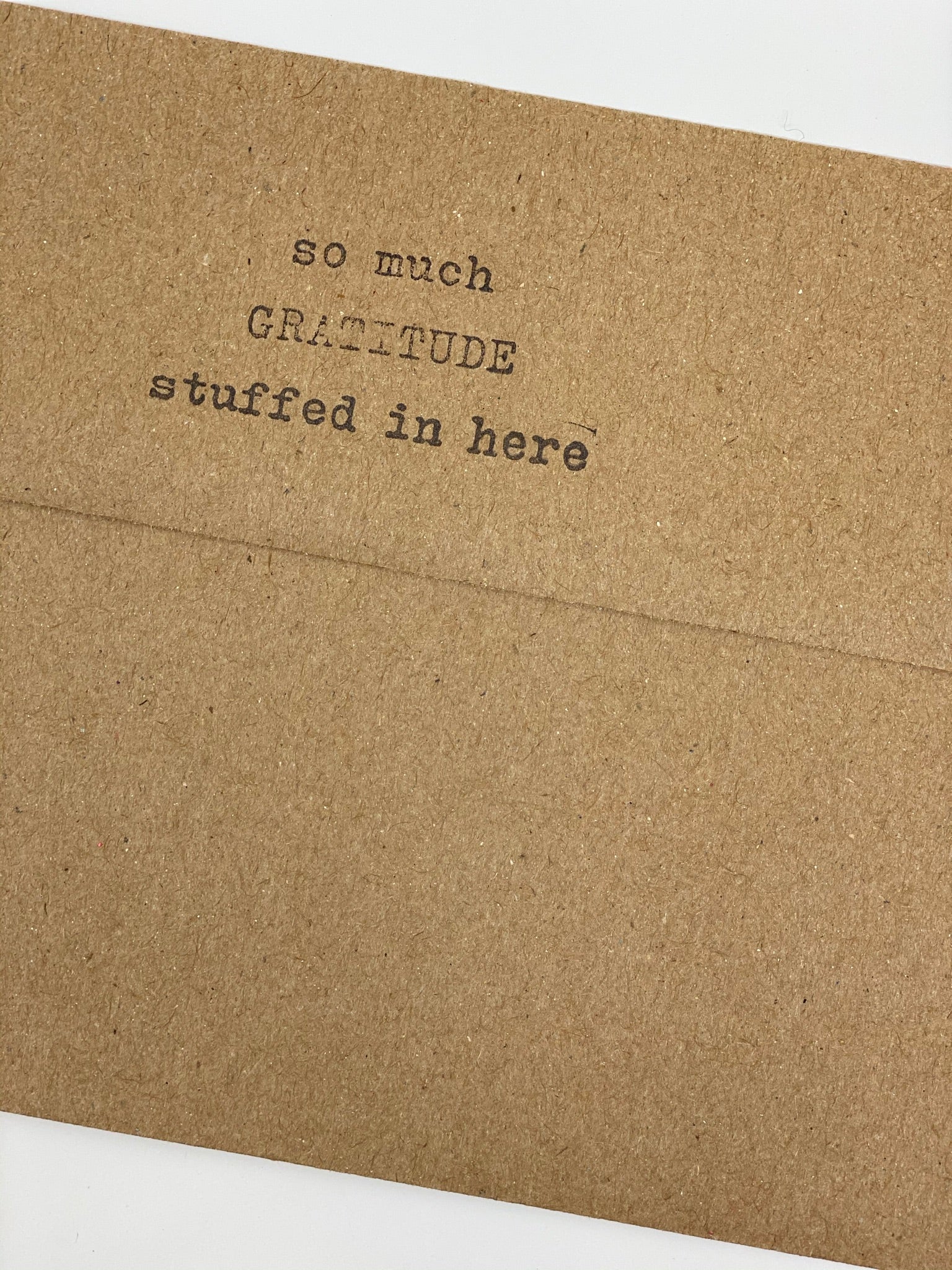 Card size: 4 1/2 x 6 1/4, with grocery bag style hand-stamped envelope